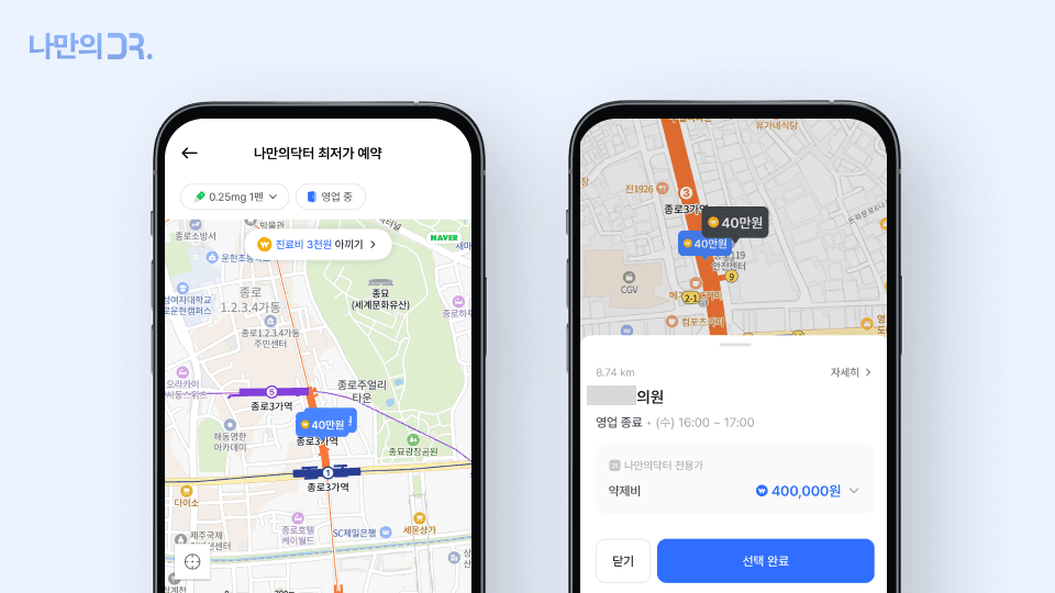 나만의닥터 앱에서는 현재 위치를 기준으로 가까운 위고비 처방 병원과 약국 정보를 쉽게 확인할 수 있습니다. 종로나 강남 같은 서울 주요 지역은 물론, 부산·대구·대전 등 전국 곳곳의 다이어트 주사(위고비, 삭센다 등) 병원과 약국 가격을 지도에서 한눈에 비교할 수 있습니다.