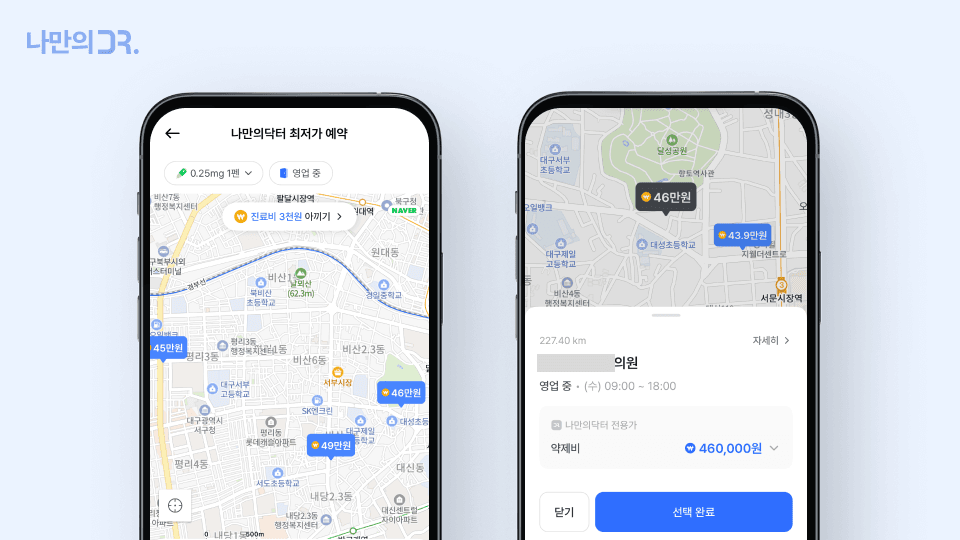 나만의닥터 앱에서는 현재 위치를 기준으로 가까운 위고비 처방 병원과 약국 정보를 쉽게 확인할 수 있습니다. 종로나 강남 같은 서울 주요 지역은 물론, 부산·대구·대전 등 전국 곳곳의 다이어트 주사(위고비, 삭센다 등) 병원과 약국 가격을 지도에서 한눈에 비교할 수 있습니다.