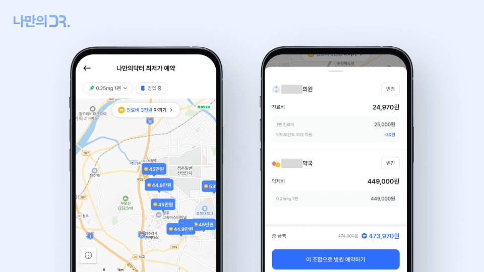 나만의닥터 앱에서는 현재 위치를 기준으로 가까운 위고비 처방 병원과 약국 정보를 쉽게 확인할 수 있습니다. 종로나 강남 같은 서울 주요 지역은 물론, 부산·대구·대전 등 전국 곳곳의 다이어트 주사(위고비, 삭센다 등) 병원과 약국 가격을 지도에서 한눈에 비교할 수 있습니다.