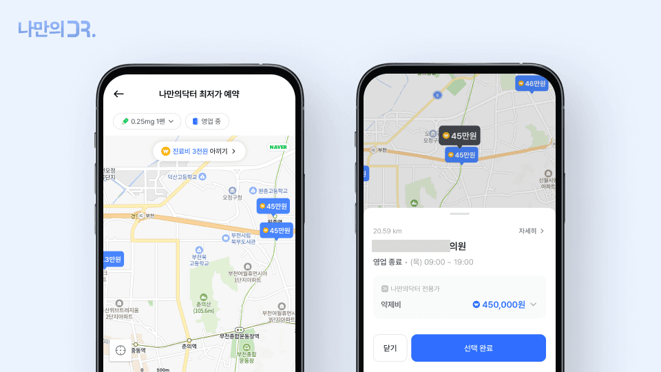 나만의닥터 앱에서는 현재 위치를 기준으로 가까운 위고비 처방 병원과 약국 정보를 쉽게 확인할 수 있습니다. 종로나 강남 같은 서울 주요 지역은 물론, 부산·대구·대전 등 전국 곳곳의 다이어트 주사(위고비, 삭센다 등) 병원과 약국 가격을 지도에서 한눈에 비교할 수 있습니다.