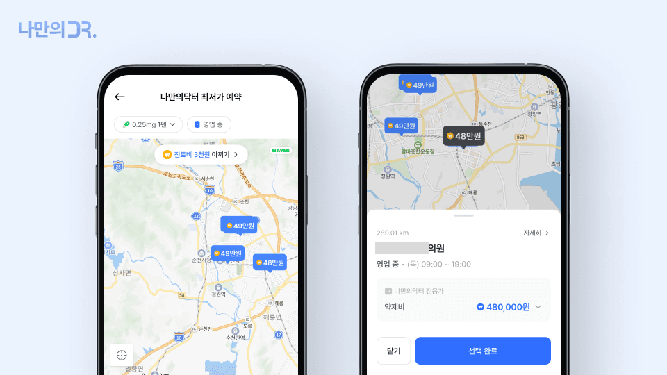 나만의닥터 앱에서는 현재 위치를 기준으로 가까운 위고비 처방 병원과 약국 정보를 쉽게 확인할 수 있습니다. 종로나 강남 같은 서울 주요 지역은 물론, 부산·대구·대전 등 전국 곳곳의 다이어트 주사(위고비, 삭센다 등) 병원과 약국 가격을 지도에서 한눈에 비교할 수 있습니다.