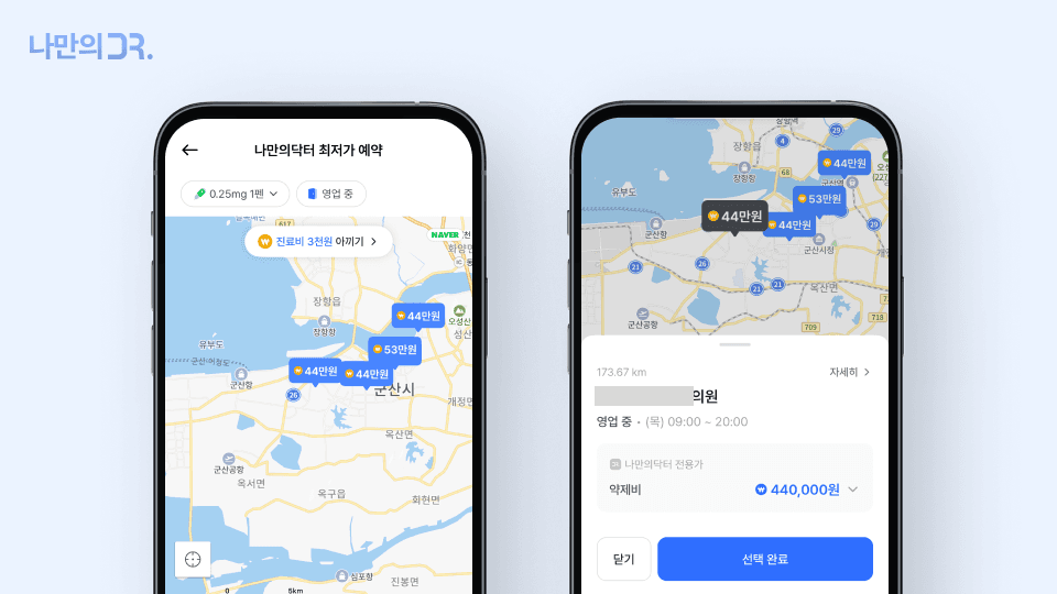 나만의닥터 앱에서는 현재 위치를 기준으로 가까운 위고비 처방 병원과 약국 정보를 쉽게 확인할 수 있습니다. 종로나 강남 같은 서울 주요 지역은 물론, 부산·대구·대전 등 전국 곳곳의 다이어트 주사(위고비, 삭센다 등) 병원과 약국 가격을 지도에서 한눈에 비교할 수 있습니다.
