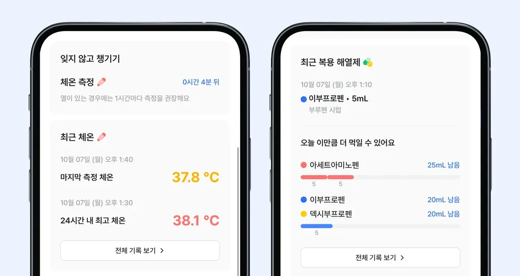 나만의닥터는 특히 아이들의 열 관리에 특화된 앱으로, 아이의 체온을 꾸준히 모니터링하며 필요할 때 빠르게 대응 혹은 비대면 진료를 받을 수 있게 도와드려요.