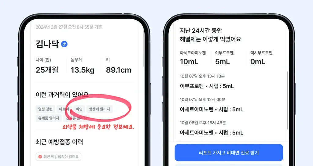 나만의닥터 앱에 아이의 과거 병력, 특이사항, 체온 변화, 해열제 복용 추이 등을 기록해 두면, 소아과 비대면 진료 시, 따로 의사 선생님께 말씀드리지 않아도 의사 선생님이 아이의 해열제 복용량, 최근 24시간 동안의 열 변화를 확인하실 수 있어요.