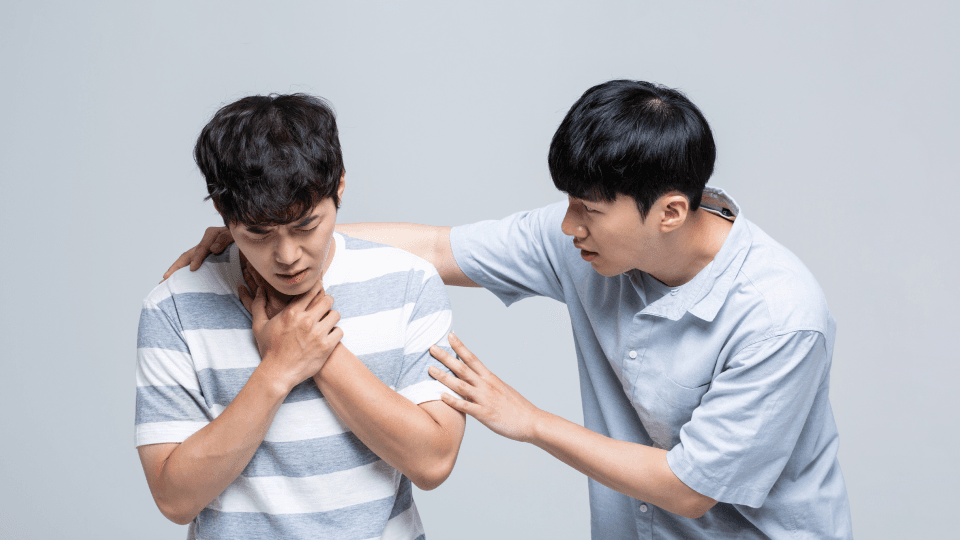 이럴 때는 응급 처치법인 '하임리히법'을 시도해야 합니다. 하임리히법은 환자의 뒤에서 감싸듯 안고 한 손은 주먹을 쥐고, 다른 손으로 주먹 쥔 손을 감싼 뒤, 환자의 명치와 배꼽 중간지점에 대고 위로 밀쳐 올리는 것입니다. 다만 하임리히법은 1세 이상의 아동이 의식이 있는 상태에서만 사용해야 합니다.