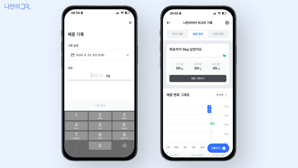 나만의닥터 어플에서는 체중을 기록하고, 변화 그래프를 통해 감량 경과를 추적할 수 있어 중간에 지치지 않고 꾸준히 다이어트를 이어가는 데 유리합니다.